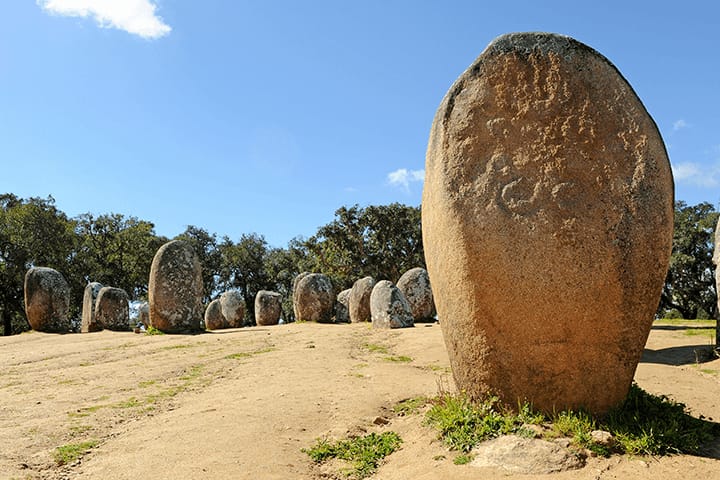 Cromeleque dos Almendres is one of the oldest and largest megalithic complexes in Europe, even predating Stonehenge, with origins going back about 7,000 years to the Neolithic period. Located near Évora in the Alentejo region, the site features nearly 100 granite standing stones—some engraved with mysterious patterns—arranged in concentric circles and ovals, believed to serve religious, ceremonial, or astronomical functions. A fascinating aspect is its orientation: the stones were positioned in relation to the movement of the sun, with one isolated menhir marking the summer solstice sunrise, underscoring the site’s possible role as a prehistoric observatory. Some of the stones feature unique engravings, such as crosiers (shepherd’s canes), wavy lines, and even stylized human figures, adding to the enduring mystery and allure of Almendres.